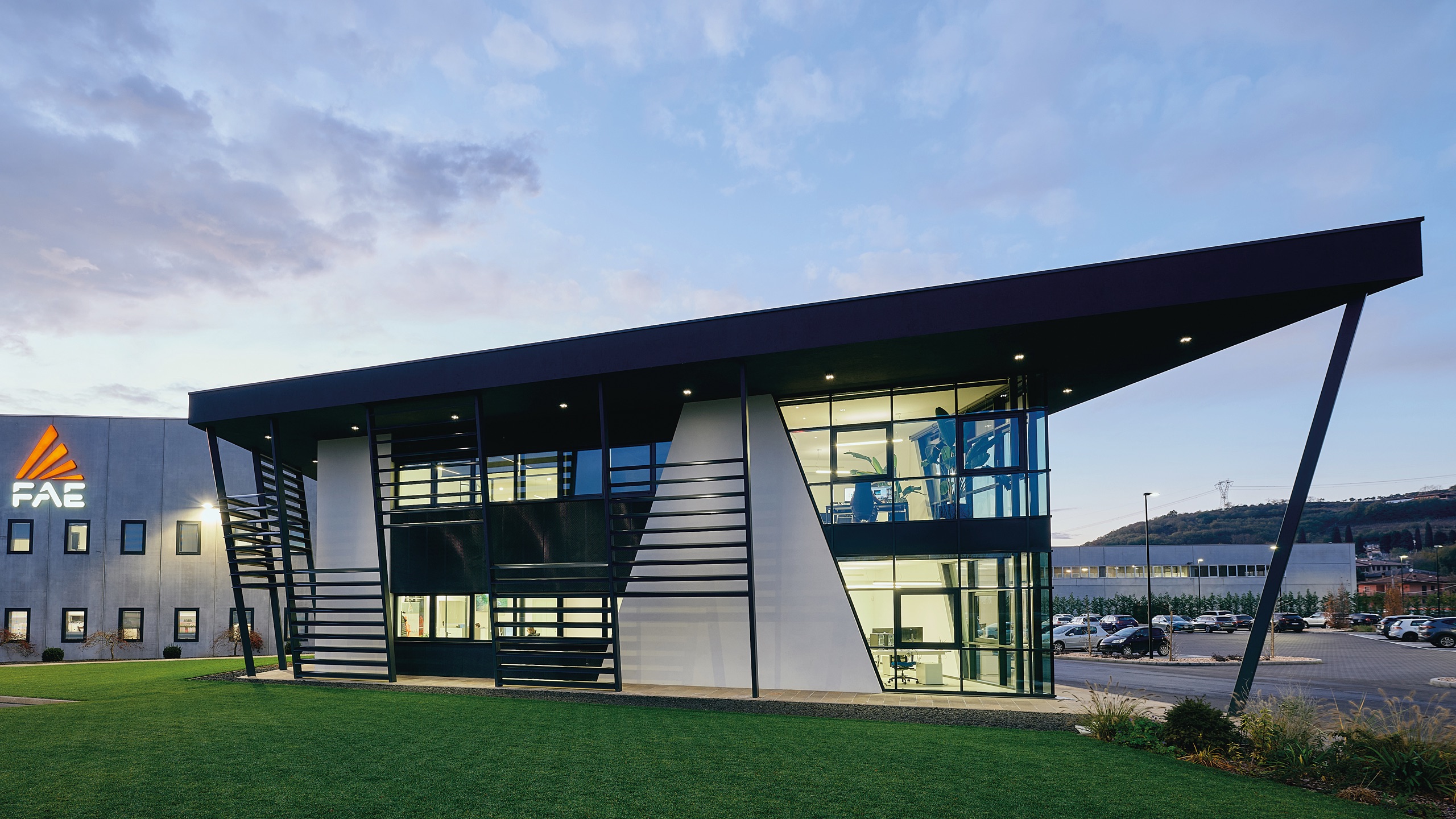 Cracco trasforma la complessità geometrica in eleganza architettonica per la palazzina uffici di FAE Mechanical Technologies Srl di Gambellara (VI).